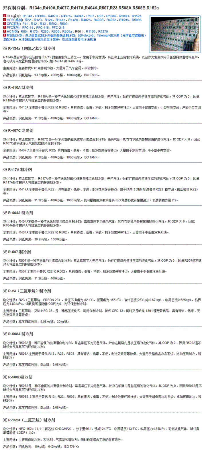 目前環(huán)保節(jié)能的方式,傾向于更高的智能化,變頻控制與運(yùn)行,還有一個重要的條件是使用環(huán)保冷媒,目前有使用R134a,R410A,R404C,等環(huán)保型制冷劑,環(huán)保制冷劑的特性如下。